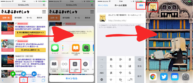 Appleの標準ブラウザ Safari の機能を使うと、きんどうをアプリ風にしてホーム画面に設置できます。Safariで kindou.info を開いて画面下部の共有ボタンから設定できます。
